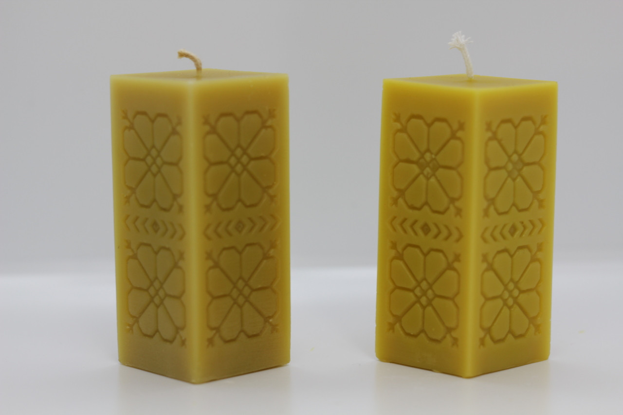 Our Square Flower Pillar Candles are great as gifts, favors or simply as a decorative candle in your home. Enjoy the sweet smell of honey as your candle burns. Great for those that have allergies or reactions to strong smells as beeswax burns clean and without leaving any residues. Our candles are all made from beeswax we've rendered down from our beehives. All our wax is 100% Beeswax with nothing else added. No fragrances, dyes or chemicals used with rendering, cleaning and making our beeswax candles.